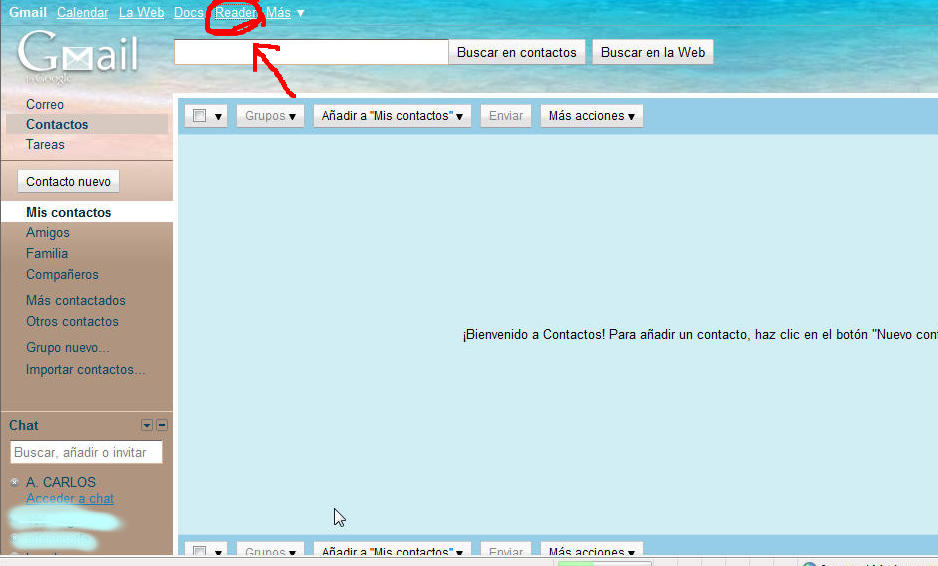 Una vez tienes la cuenta de corréo gmail, verás esta pantalla. Haz click donde señalamos en rojo, la pestaña READER