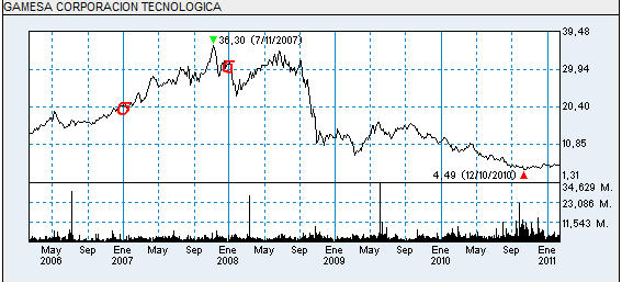 Gamesa: La descartada por analistas. Recuerdo que se decía algo así como: «Es una empresa que vive de subvenciones por lo que no es aconsejable invertir en ella a corto plazo, aunque puede ser muy rentable para un inversor paciente a largo plazo. Veamos su gráfico de evolución en bolsa: