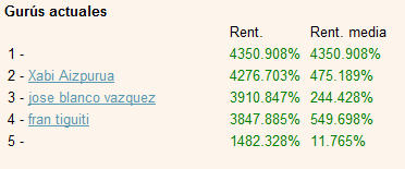 Nota: Una vez comenté en un foro de finanzas y supuestos inversores cual era mi rentabilidad media en bolsa, a pesar de no detenerme a analizar gráficos y ser una persona que huye de los riesgos. Tuve la sensación de que en el mundo de la inversión en bolsa hay muchas personas que entran y ven un éxito el obtener un 6% de rentabilidad anual. Yo por esa cantidad no entro en bolsa y me quedo en un plazo fijo al 4%.