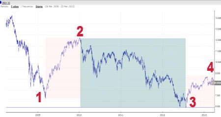 En el gráfico hemos dibujado los puntos 1 (punto de salida alcista en 2009), punto 2 (chocamos con la realidad en 2010), punto 3 (consecuencias de haber chocado con la realidad y punto de salida en 2012) y punto 4 ( nuevo choque con la realidad). El punto 5 lo dejamos para que lo coloquéis allá donde creéis que se va a colocar, aunque ya os doy pistas, y es que no va a estar por encima de los 9.000 puntos.