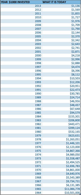 El gráfico indica el dinero que tendríamos según el año en el que hayamos invertido esos 1.000€, por lo que incluso el haber comprado acciones en el año 1978, nos habría convertido en millonarios. Nuevamente se puede observar cómo con la inversión en una empresa sólida en constante crecimiento, un buen gestor y paciencia en la inversión, los resultados acaban haciendo nuestra inversión muy rentable en el largo plazo.