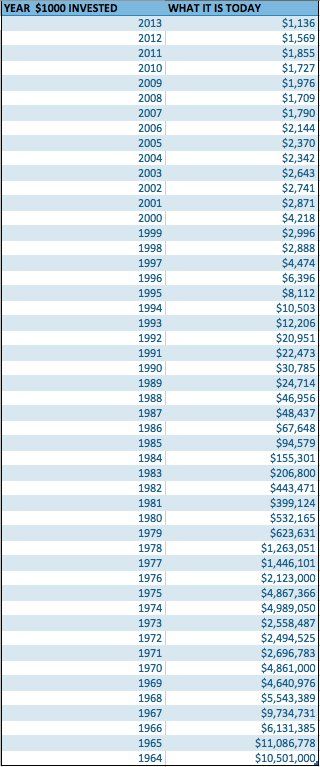 Puestos a imaginar, vamos a suponer que en el año 1964, tu padre hubiera decidido confiar su dinero a aquel joven Warren Buffett, con la compra de acciones de aquella compañía (por aquel entonces una empresa textil). Es decir, comprar 1.000€ en acciones de Berkshire Hathaway.