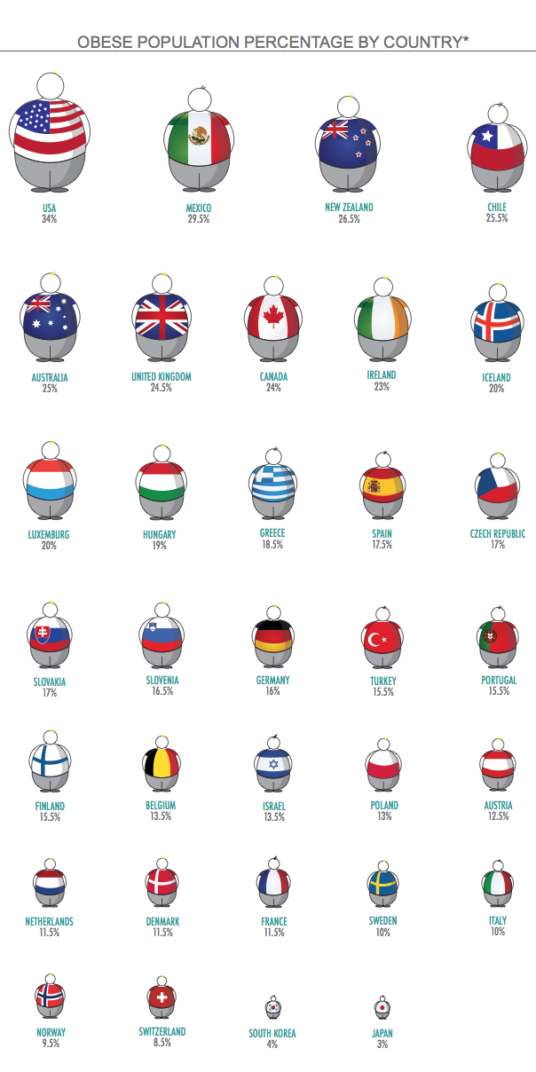Llama la atención que sea Japón el que toma esta media, y no Estados Unidos que es el país con más tasa de obesidad de todo el mundo, como podemos observar en este gráfico elaborado por flabbyfashionista