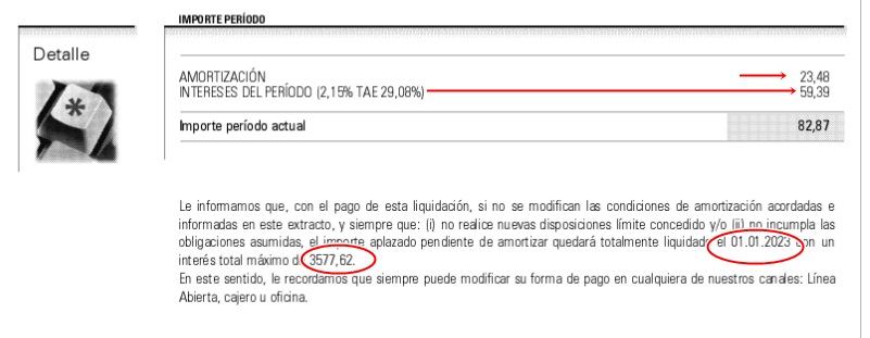 Como podemos ver, de los actuales 82,87€ que paga este usuario, tenemos una amortización de 23,48€. Es decir, tras pagar esos 82,87€, en la tarjeta únicamente se «reponen» 23,48€. El resto del pago es cobrado en intereses, que suponen 59,39€.