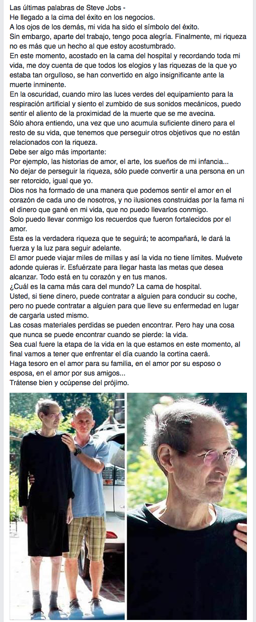Estas supuestas últimas palabras de Steve Jobs se han compartido millones de veces por las redes sociales con  decenas de millones de «likes». También se llevaron a un vídeo de Youtube, por parte de Badabun (que publican sin confirmar la veracidad del contenido),  con millones de visualizaciones  pues supongo que es un mensaje que a la mayoría de la gente le gusta escuchar. Es como tener la excusa perfecta para no pelear por tus sueños, porque tenemos a un hombre de éxito arrepentido de haber dedicado su vida a luchar por sus sueños.